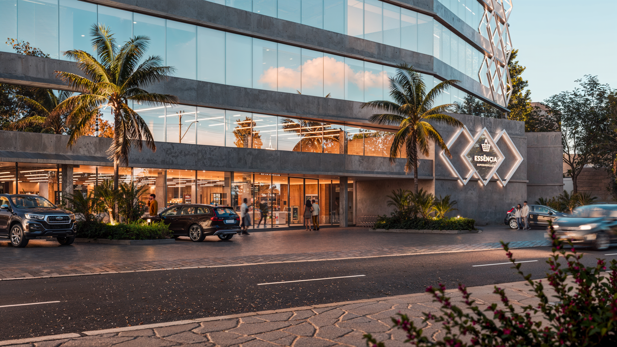 Um centro comercial moderno, com design exclusivo e inovador, que se destaca na paisagem pela imponente fachada e ampla vitrine.
