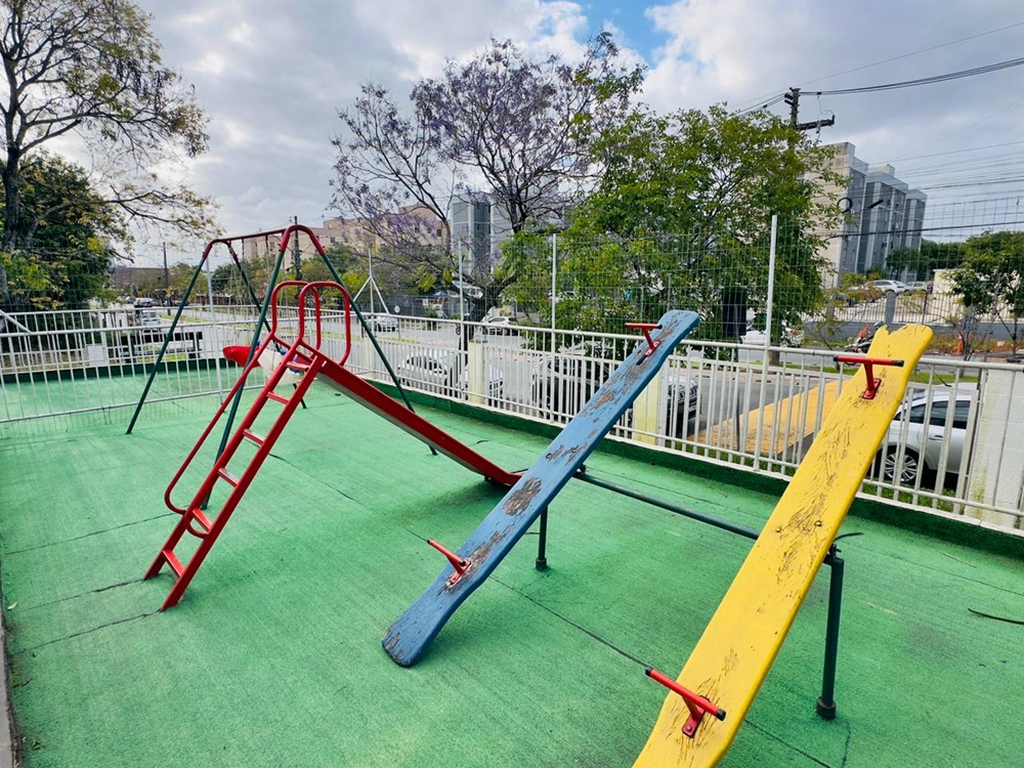 Apartamento no bairro Jardim Leopoldina, em Porto Alegre, no Condomínio Juscelino Kubitscheck 1. Possui dois dormitórios, piso em porcelanato, sala para dois ambientes com rack, cozinha com pia e balcão, área de serviço integrada com tanque, banheiro social com pia, armário e box de vidro, além de cortinas nas janelas e luminárias. O condomínio conta com salão de festas, circuito interno de câmeras, estacionamento rotativo, playground, quadra de esportes, quiosque com churrasqueira, zelador e lavanderia coletiva. Localizado próximo à Praça México, Avenida Manoel Elias, Stock Center e ao futuro Fort Atacadista. Aceita financiamento, FGTS e compra assistida. Preço e disponibilidade do imóvel sujeitos a alteração sem aviso prévio.