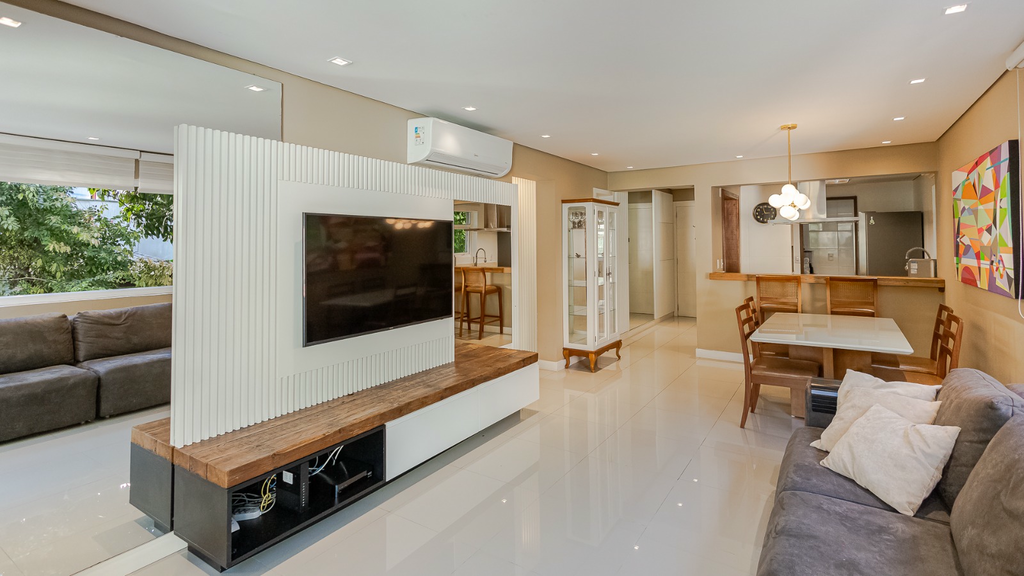 Apartamento semi-mobiliado, com área externa grande e agradável para aproveitar o sol e receber visitas.