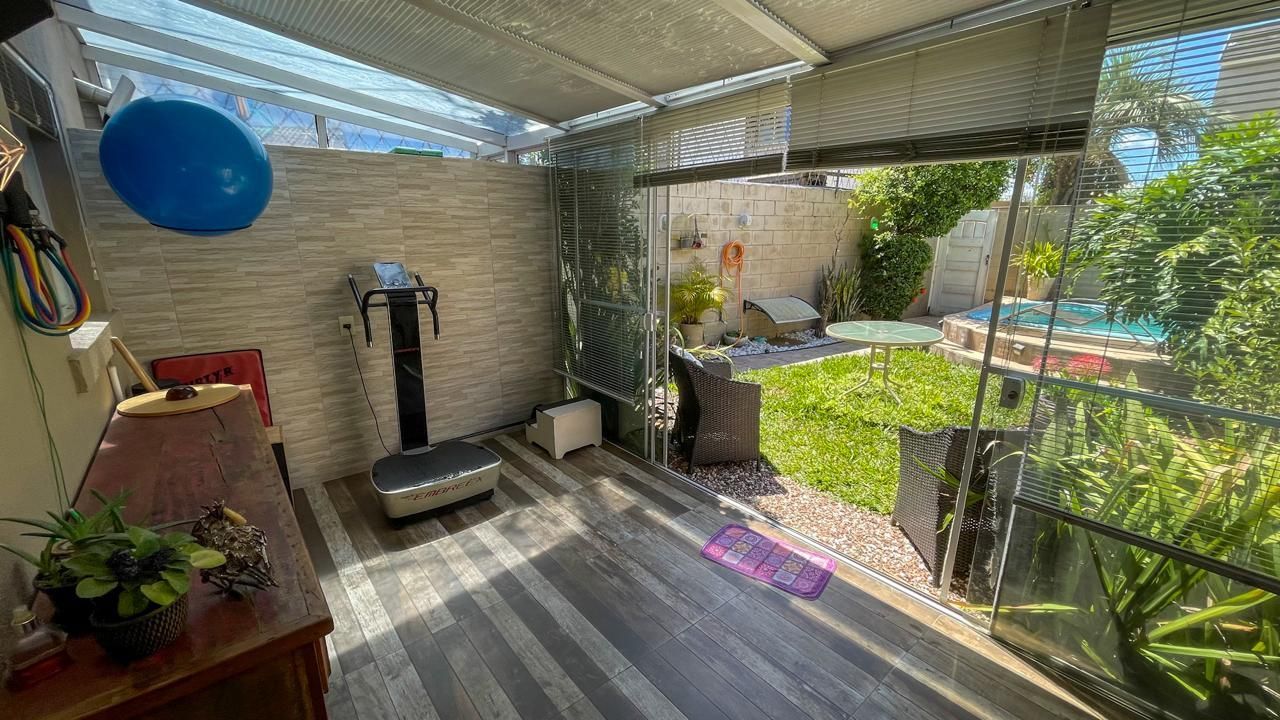 A casa possui piscina privativa, lavabo, dois banheiros sociais e duas vagas de garagem. Totalmente mobiliada, conta com armários planejados em todos os ambientes, além de quatro aparelhos de ar-condicionado split instalados, oferecendo conforto térmico em todas as estações.