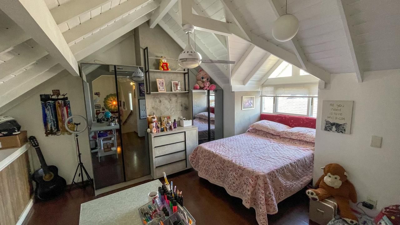 São quatro dormitórios, sendo uma suíte com banheira de hidromassagem e uma suíte americana que atende a dois quartos, garantindo praticidade e privacidade. O sótão foi transformado em um quarto adicional, ideal para visitas, home office ou sala de lazer.