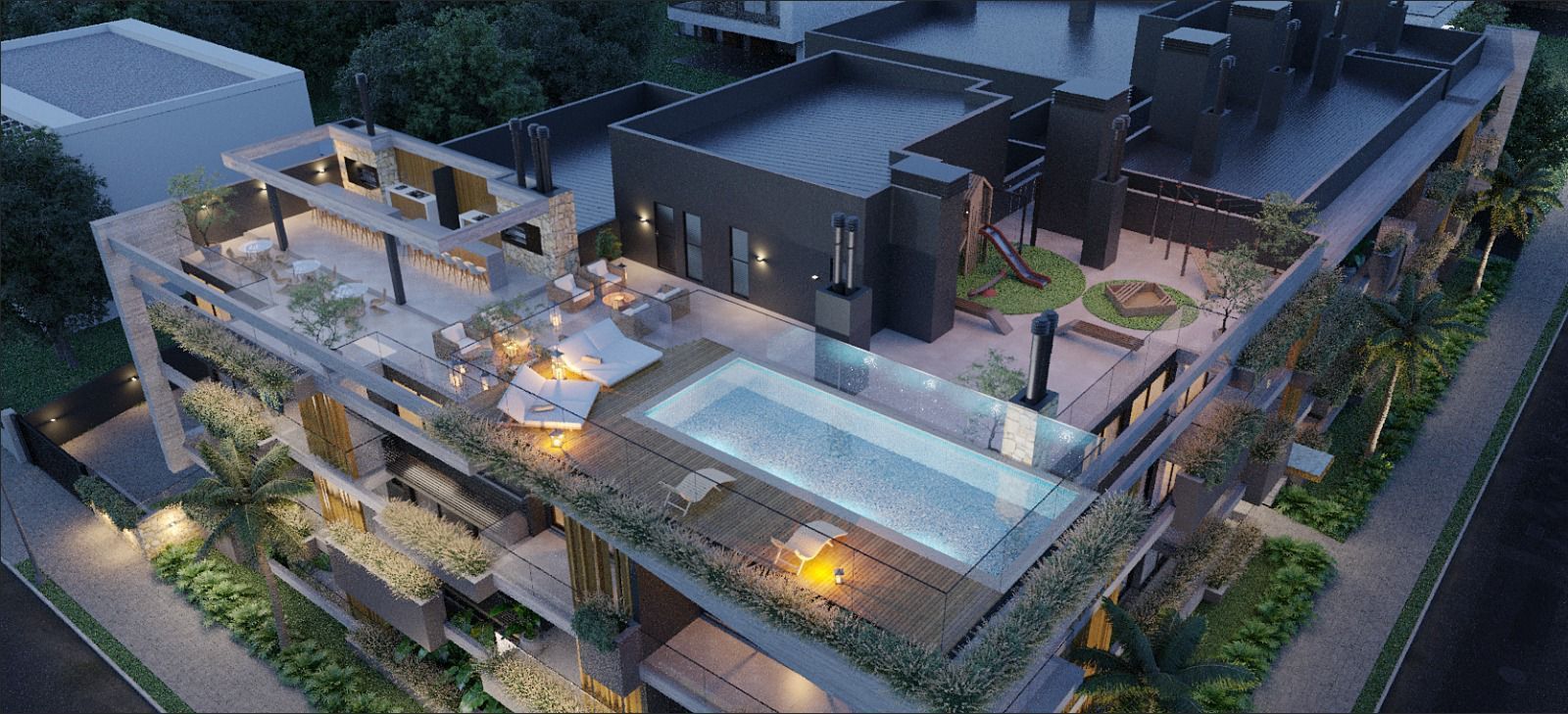 - Rooftop com; Espaço Gourmet, Fireplace, Piscina/Lounge piscina, Espaço Kids.