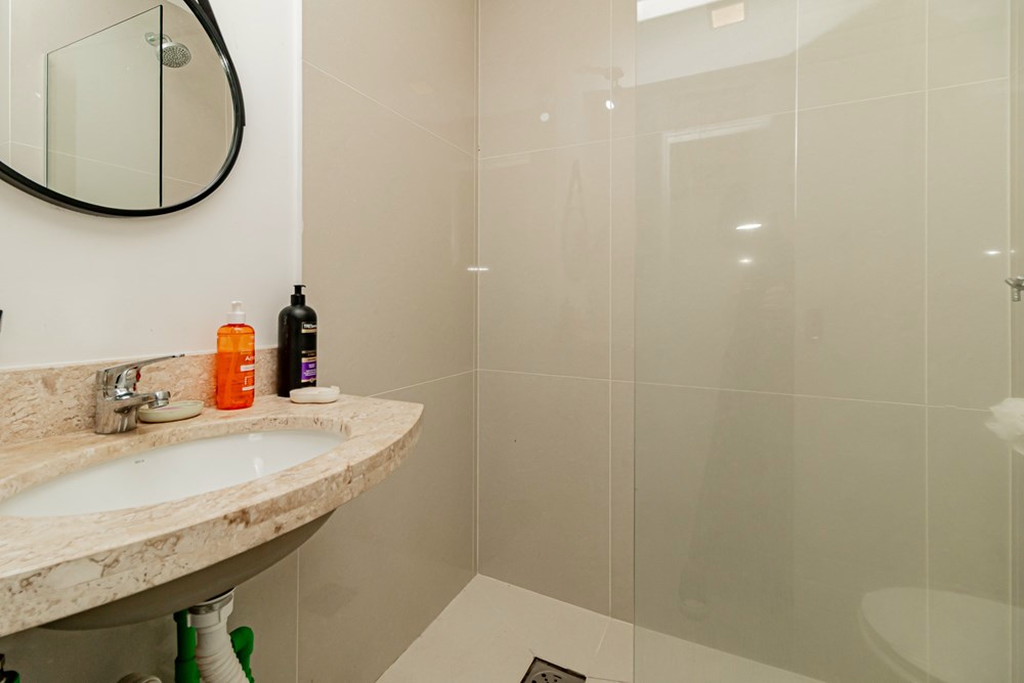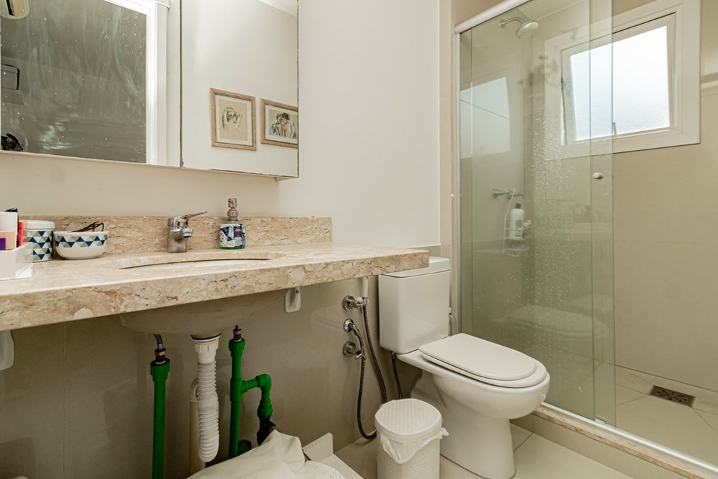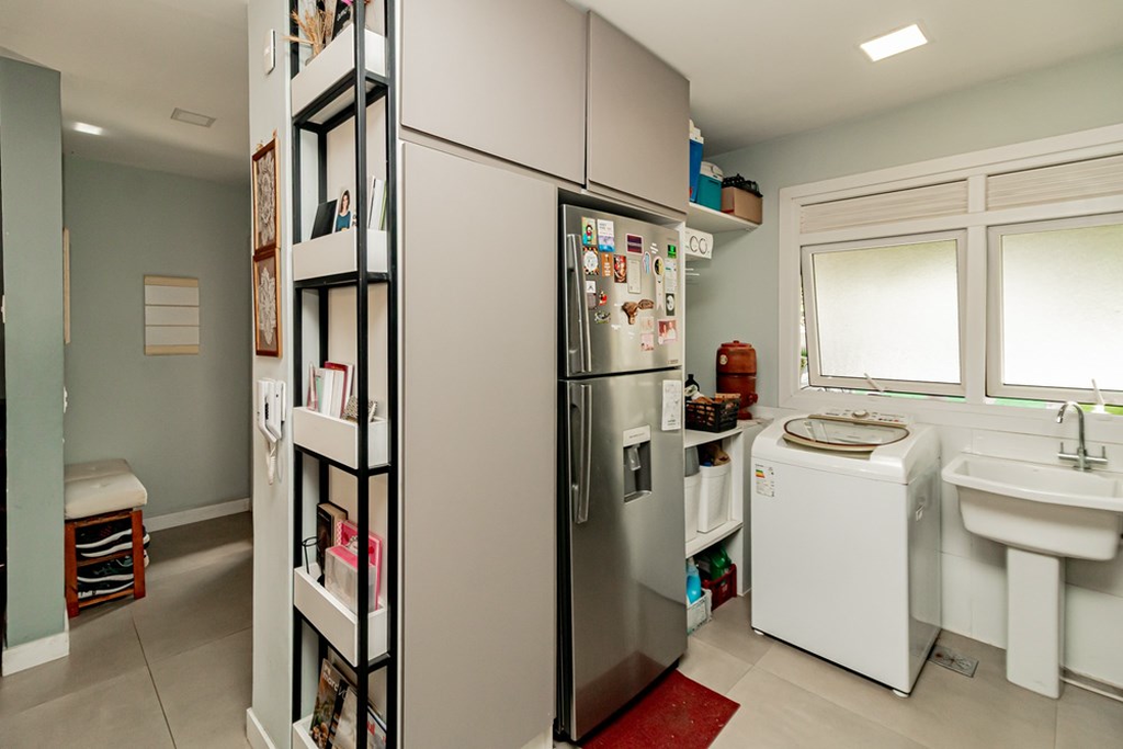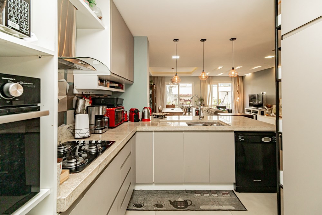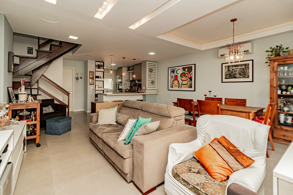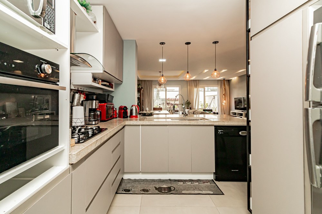 A casa tem 3 níveis: no térreo um hall de entrada ,um lavabo, uma cozinha americana com móveis planejados que se integra perfeitamente ao estar social com amplos espaços para toda família se reunir. Na sequência um jardim privativo com churrasqueira, entre plantas e flores.